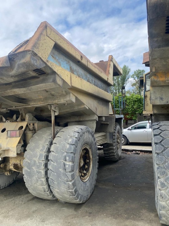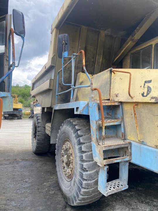 Автосамоскид кар'єрний має ознаки інтенсівної експлуатації. Значні корозійні пошкодження на елементах кузова, несучій рамі, та кабіні. Фарбування частково стерте або вигоріло, в нижній частині кузова та по боках видно численні потертості й відколи. Металеві поверхні місцями деформовані. Блок фари пошкоджени. Шини мають видимий знос, візуально виглядають зношеними. Технійний стан не перевірявся, ключі та технічний паспорт в наявності. Пробіг не відомо так як немає можливості перевірити. АКБ транспортного засобу відсутній.