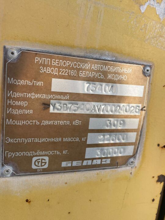 Самоскид марки БелАЗ-7540А, 2007 року випуску, двигун № 70022828, шасі (рама) № Y3B7540AV70024026, реєстраційний номер ХАТ2020, по всьому кузову наявні пошкодження лако-фарбового покриття у вигляді подряпин, сколів та слідів іржі. Перевірити технічний стан, пробіг та повноту комплектації неможливо Свідоцтво про реєстрацію транспортного засобу та ключі відсутні. Відомості про реєстрацію права власності підтверджено відповіддю Головного управління Держпраці у Харківській області