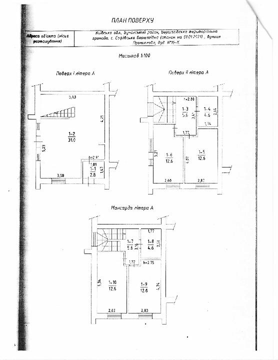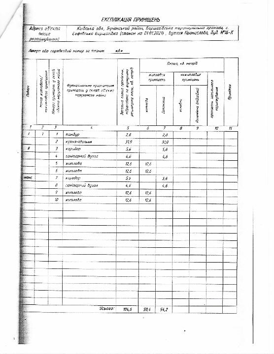 Житловий будинок садибного типу за адресою: Київська обл., Бучанський р., с. Софіївська Борщагівка, вулиця Промислова, будинок 16-К, РНОНМ: 2872719432080. Загальна площа житлового будинку садибного типу 104,6 кв.м, житлова площа 50,4 кв.м., будинок чотирьох кімнатний. Кількість поверхів – 2 + мансарда. Водопостачення – так, каналізація та водовідведення – центральне, електропостачання – так, опалення – місцеве. Фундамент – залізобетон, стіни – цегла, перекриття – дерево, залізобетон, підлога – бетон, покрівля – метало-черепиця. Тамбур – 2,8 кв.м., кухня – їдальня – 31,0 кв.м., коридор – 5,6 кв.м., санітарний вузол – 4,6 кв.м., житлова – 12,6 кв.м., житлова – 12,6 кв.м., коридор – 5,6 кв.м., санітарний вузол – 4,6 кв.м., житлова – 12,6 кв.м., житлова – 12,6 кв.м.